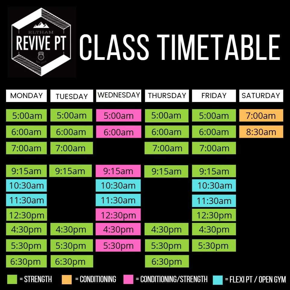Below is a rundown of a typical week with Revive PT, and the primary exercise for that day. Beyond that is our accessory and secondary exercises that compliment the primary exercise/movement.